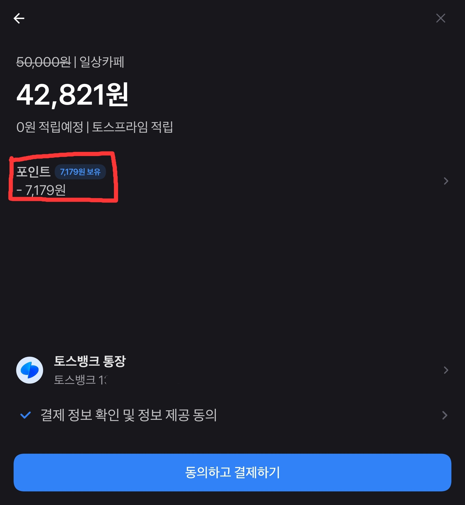 결제 시 토스포인트가 있다면 사용-결제 방식(카드/계좌)-결제하기
